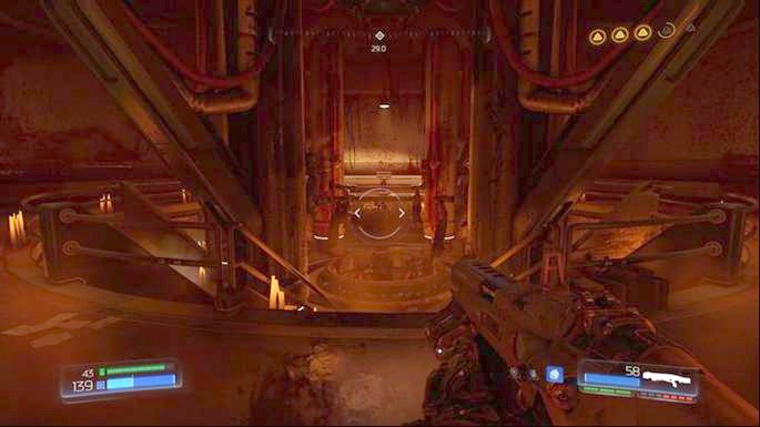 Вы переместитесь в место, заполненное демонами. Сначала избавьтесь от большинства зверей с помощью Пушки Гаусса. Время от времени прячитесь за укрытие, затем бегите к центру и продолжайте двигаться быстро, используя гравитационные прыжки. В этой локации будет много импов, их легко убить более слабым оружием. Держите BFG обвинения для более сильных зверей, которые появляются в конце. Вы также должны выбрать Ускорение, лежащее ниже, и усиление Quad Damage, которое плавает в середине. Можете использовать начало битвы, чтобы завершить одно из испытаний - просто стреляйте правильно из BFG.