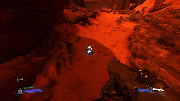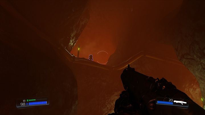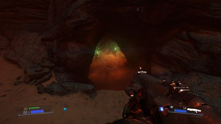 Как только вы доберетесь до поверхности планеты, спрыгните вниз и идите прямо вперед. Не беспокойтесь о высоте. Ваша броня будет поглощать воздействие падения. Придерживайтесь правой стороны каньона, вы найдете боеприпасы и первый журнал данных. Чуть дальше встречается большое количество врагов. Среди них будет несколько одержимых солдат. Они медленные, но довольно стойкие. В основном они будут стрелять в вас из быстрых пулеметов, но время от времени они также будут стрелять большими светящимися шарами, которые взрываются через некоторое время и наносят большое количество урона. Попробуйте избавиться от этих врагов в первую очередь.