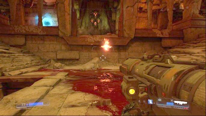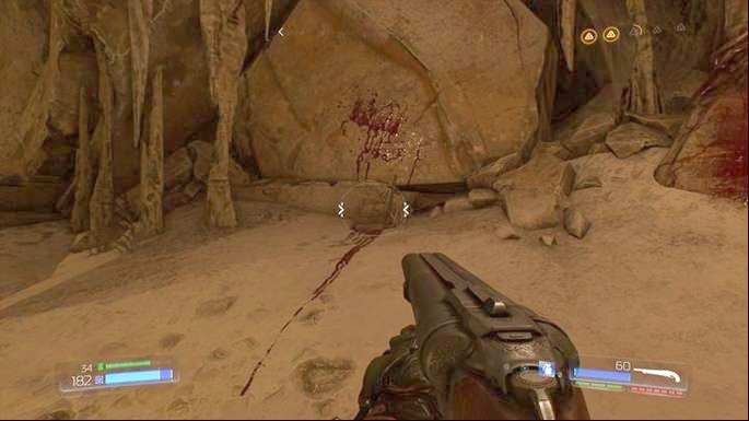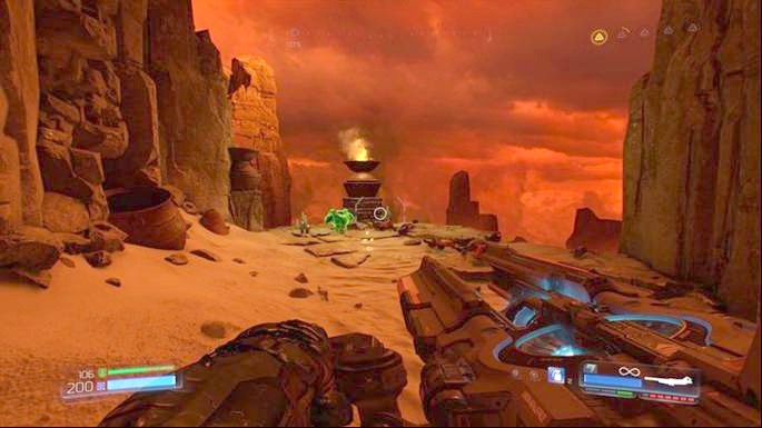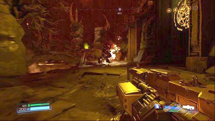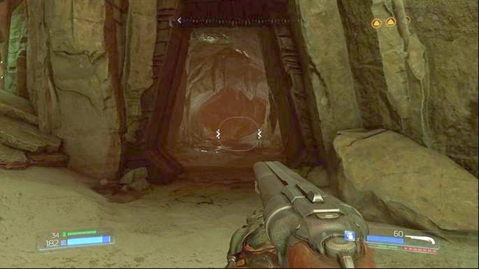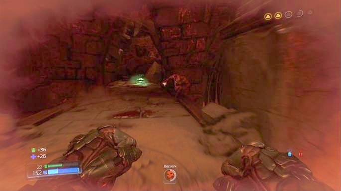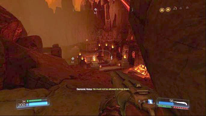Прыгая между скал, вы достигнете места с тремя дорожками. Сначала идите направо, где можете убить двух импов и выбрать дополнительную броню. Затем используйте первый путь налево и идите к месту с порталами и зеленым огнем. Вскоре вы будете сражаться с большой группой демонов. Эта битва немного легче, чем предыдущая. Только не забудьте использовать порталы, гравитационные прыжки и Четырехкратный урон. На арене вы также найдете боеприпасы для BFG. Вы должны использовать его для завершения одного из испытаний.