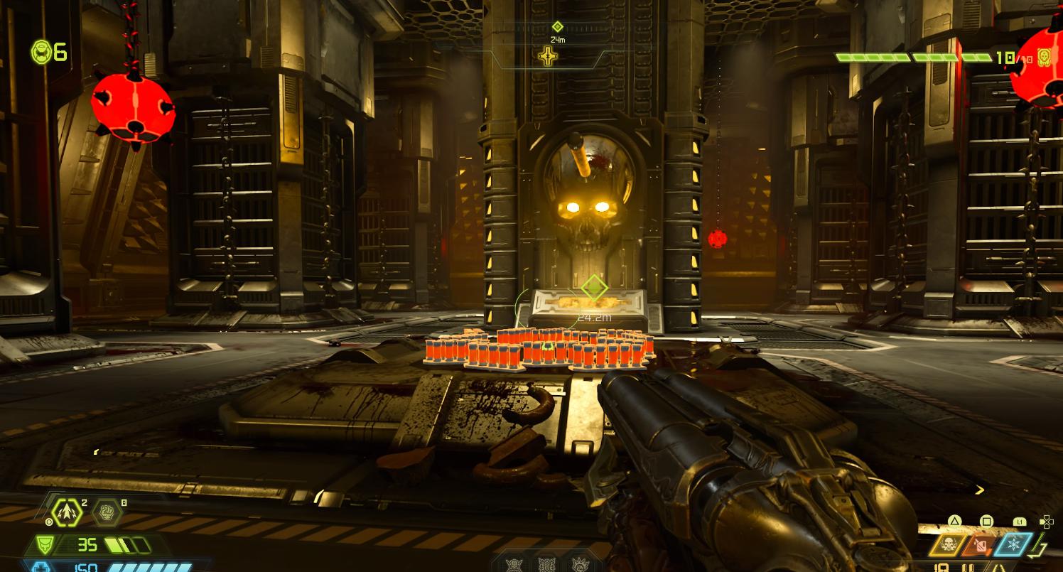 Поднимитесь на лифте, и вы попадете в комнату с тремя рядами колонн, в которых находятся разные враги. Прежде чем что-то делать, откройте лучше колону, расположенную дальше всего слева в среднем ряду. Внутри тонны патронов к дробовику, которые пригодятся, когда вы начнете открывать остальные колонны. Первый ряд содержит обычных врагов, в то время как остальные будут наполнены такими серьёзными противниками, как Адские Рыцари, Арахнотроны и Ревантанты.