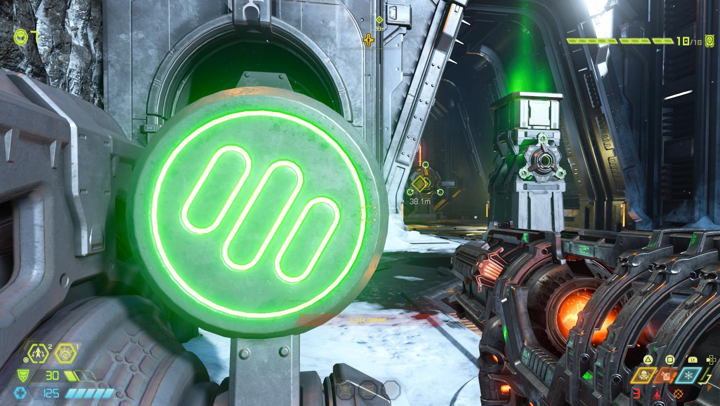 Пройдите через следующую дверь в ледяную зону и используйте свой двойной прыжок и рывок, чтобы пройти по коридору с наэлектризованной кровью. Открыв путь вперед, взайдите на платформу, чтобы добраться до нижней части локации, затем следуйте по коридору. Далее будет ещё один столб. И вновь тайминг. Также стреляйте в зелёную кнопку-символ. Затем прыгните на левую платформу, убейте врагов на этом верхнем уровне и прыгайте дальше, чтобы снова избежать электрифицированной крови.