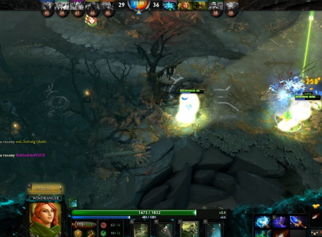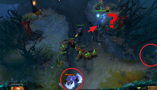 Ладно. Возвращаюсь на лайн и начинаю методично фармить, ибо керри. Тут главное следить, чтобы всегда оставалась мана на windrun, и здоровье не падало до такого уровня, что вас очень захотят убить. Против меня стояли АМ и Скай. Причем на Скае некая Маруся видимо одержима бесом, это она сделала ФБ, потом постоянно харасила, не подпуская к крипам, делала отводы, в общем потела как могла. Мой же напарник Лич наблюдал бои крипов и особо не суетился, пока его в конце концов не прибили. Если у тебя нет windrun, то вот так стоять не нужно.