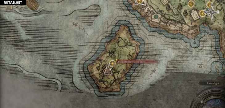 Выйдя из другого конца пещеры, вы попадаете на остров у западного берега Замогилья. Поднимитесь на холм, чтобы найти Храм драконьего причастия. Если вы взаимодействуете с каменным столбом, из которого выходит красное пламя, то сможете обменять Сердца Дракона на некоторые уникальные чары позже, когда вы получите Сердца Дракона, убивая драконов.