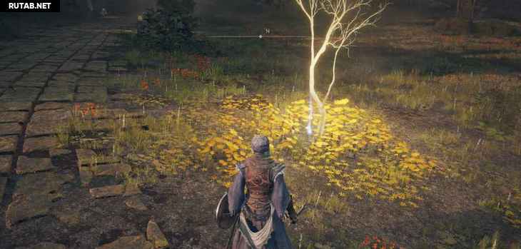 Это будет Золотое семечко, и рядом с каждым из этих золотых деревьев, которые вы видите, будет как минимум 1 такое семечко. Их можно использовать для улучшения вашей фляги — семечки увеличивают общее количество использований фляги. Как только вы подберете его, продолжайте подниматься по холму к зданиям справа, чтобы добраться до следующего места благодати.