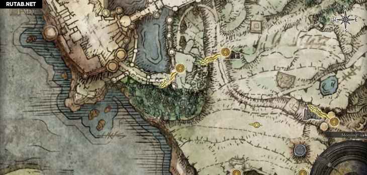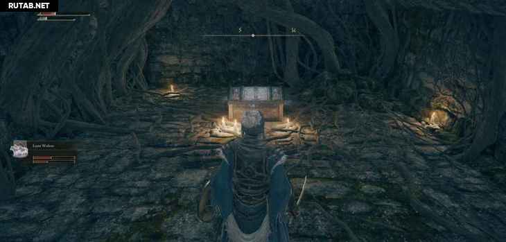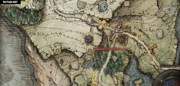 Если вы пойдете в южный угол руин, вы найдете лестницу, ведущую вниз под землю. В каждой руине на карте будет подобная лестница с комнатой внизу с добычей (хотя иногда вам нужно сначала пройти через врага). Здесь вы найдете предмет Точильный нож , который позволяет вам назначать Пепел Войны на ваше оружие в местах благодати, а также дает ваш первый пепел — Грозовой удар.