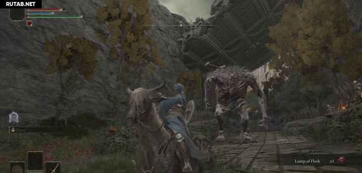 Вы можете попытаться разобраться с врагами в этой области, если хотите, катаясь на Потоке и рубя на ним, пока вы пробегаете мимо. Гигант довольно медленный, так что вы просто подбегаете и бьете его по ногам после того, как он атакует. Если вы хотите просто пробежать через область, то можете перепрыгнуть через баррикады на своем пути, а затем следуйте по дороге. Когда вы заметите золотое дерево справа, убедитесь, что вы взяли предмет рядом с ним.