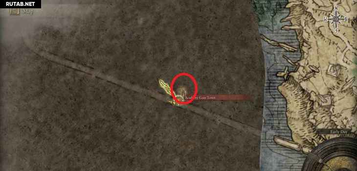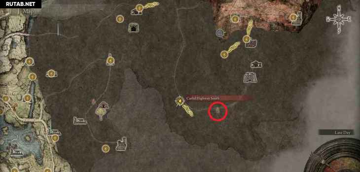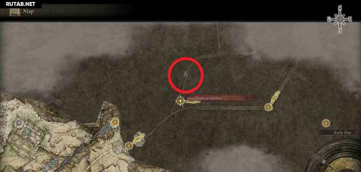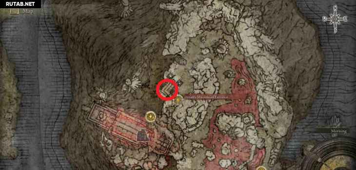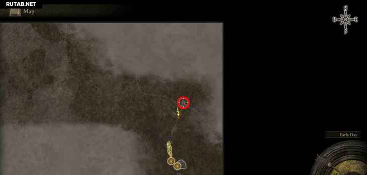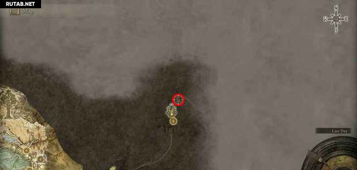 - Локация ↑ – Вулкан Гельмир: Девятый лагерь вулкана Гельмир ↑ – Сначала вам нужно добраться до вершины горы, где находится босс Взрослый зверь Падающей звезды, после места благодати Девятый лагерь вулкана Гельмир. Вам не нужно убивать босса. Справа от босса находится скала в форме шипа, по которой вы можете проехать на своем скакуне и перепрыгнуть на другую сторону, чтобы попасть в область вулканово поместье. Вместо того, чтобы идти в вулканово поместье, спуститесь по склону вправо перед усадьбой, и вы придете к этому фрагменту карты.