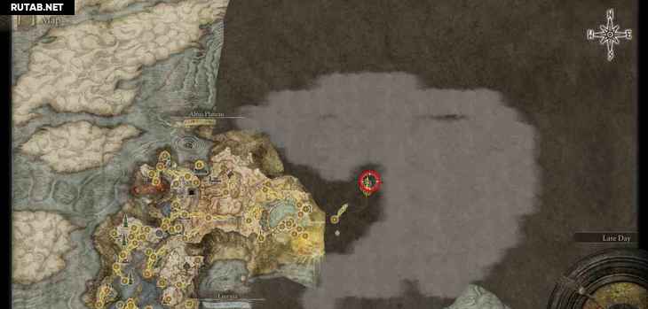 - Локация ↑ – Озёрная Лиурния: Северный берег озера Лиурнии ↑ – плита находится прямо к северу от этого места благодати. По умолчанию не отображается на затуманенной карте, только при приближении к ней. Находится на северо-западной окраине Озёрной Лиурнии (большая затопленная территория).