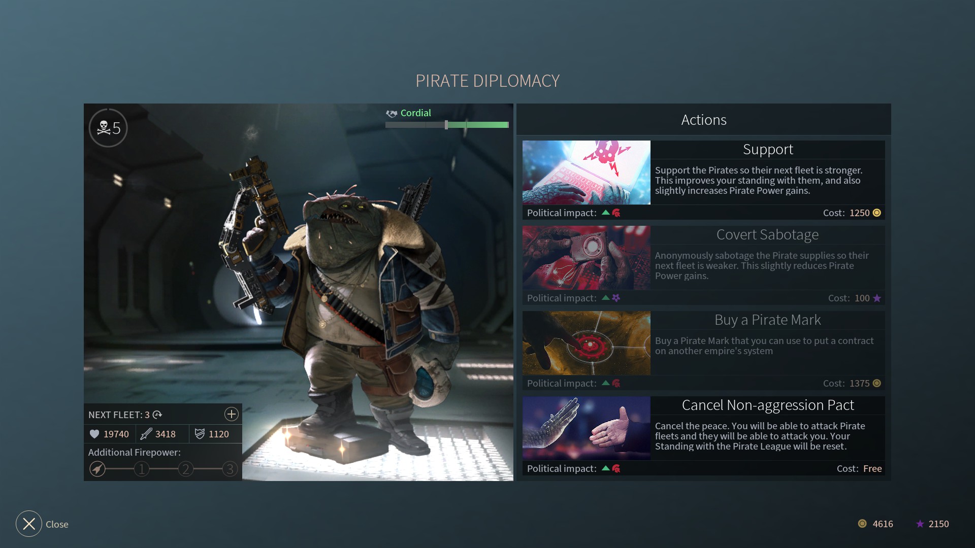 Пираты — малая фракция, которую невозможно ассимилировать. Никто не может. Это ведь пираты! Пираты вольны нападать на конвои и системы любых фракций, грабить и убивать. Пираты заселяются на незанятых другими фракциями системах. Они могут стать настоящей напастью для неподготовленного игрока. Но есть решение. Дружба с пиратами! Найдя пиратов, откройте окно дипломатии с ними. Оно будет как на скриншоте. В начале у вас будет доступна только кнопка поддержать. На поддержку тратится пыль. Каждый раз нажимая на кнопку поддержать, вы поднимаете уровень взаимотношений с ними. Легче всего за раз прокачать до максимума, или хотя бы до половины. Правда, понадобиться пыль. Так вот, прокачав хотя бы до половины, вам откроются кнопки Саботажа (удар в спину пиратам, иными словами) и покупка пиратской метки. Метка позволит вам выбрать систему вашего врага/друга/участника альянса и поставить на неё метку. Пираты как можно быстрее скоординируют свои силы чтобы напасть на систему. Если налёт удастся, вы получите долю. Дружба с пиратами нужна в большей степени даже не для меток, а для того, чтобы вам не пришлось их ловить и воевать. Они как саранча. Зато эта саранча будет ставить палки в колёса вашим конкурентам. Так что незачем их уничтожать раньше времени.