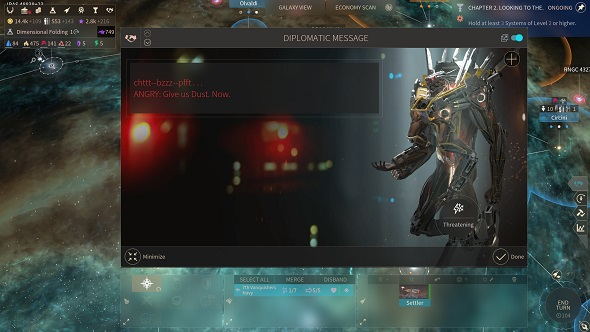 - Война. Рано или поздно с какой-нибудь фракцией она начнётся. Её могут объявить вам, а можете объявить вы. Правил никаких нет, вы можете давить на них через галактический рынок (это не прописанная механика, суть довольна проста: смотрите в чём сильнее всего нуждается вражеская империя и скупаете эти ресурсы в ноль). Но конечно же не обойдёте без классики. Направляйтесь к вражеским системам, уничтожайте флоты, захватывайте системы, истощайте врага. Если ваш враг поймёт что сильно сдаёт позиции и на грани поражения, он может вам прислать ноту мира. Обычно в таком случае фракции предлагают вам ещё какой-то дар (ресурсы, системы), лишь бы вы остановились. Только такого точно не ждите от Пожирателей. Они неприклонны.