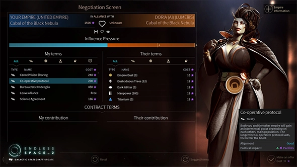 Каждый раз, когда вы решите с любой фракцией торговать/предлагать договоры/сотрудничать вы будете тратить влияние (розовые звёздочки). И конечно же, точно также могут поступать другие фракции. Вы также можете запрашивать у фракции что-то конкретное. В любом случае, ваш "коллега" может согласиться на предложение, а может и отказаться. И не забывайте, что находясь в альянсе, вы чаще будете получать просьбы от участников альянса. Впрочем, точно также вы можете просить их о чём-нибудь безвозмездно.