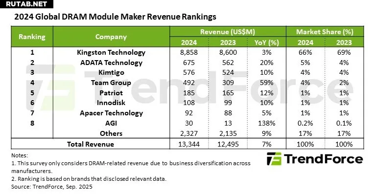 В 2024 году пятерка ведущих производителей модулей DRAM захватила 81% от общего объема глобальной выручки, а первая восьмерка — 83%. Компания Kingston сохранила лидирующие позиции с долей рынка в 66%. Однако ее рост выручки был медленнее по сравнению с конкурентами из-за более слабого спроса в потребительском сегменте во второй половине 2024 года. Kingston оставалась сфокусированной на своем имидже премиального бренда, делая акцент на прибыльности.