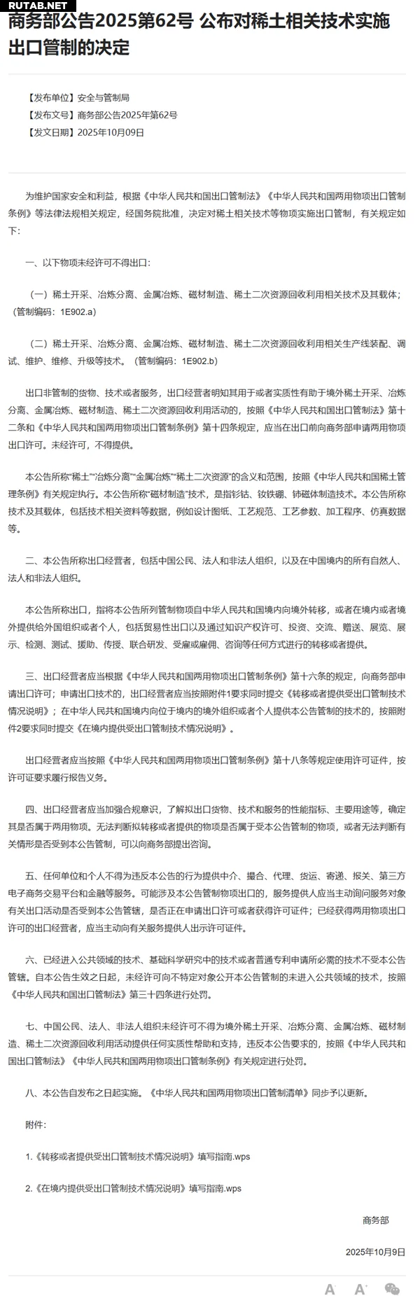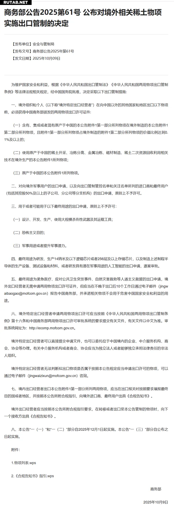 Пользователи обнаружили, что Министерство коммерции КНР 9 октября опубликовало официальное объявление №61 за 2025 год о введении экспортного контроля над некоторыми зарубежными редкоземельными материалами, содержащими китайские компоненты.