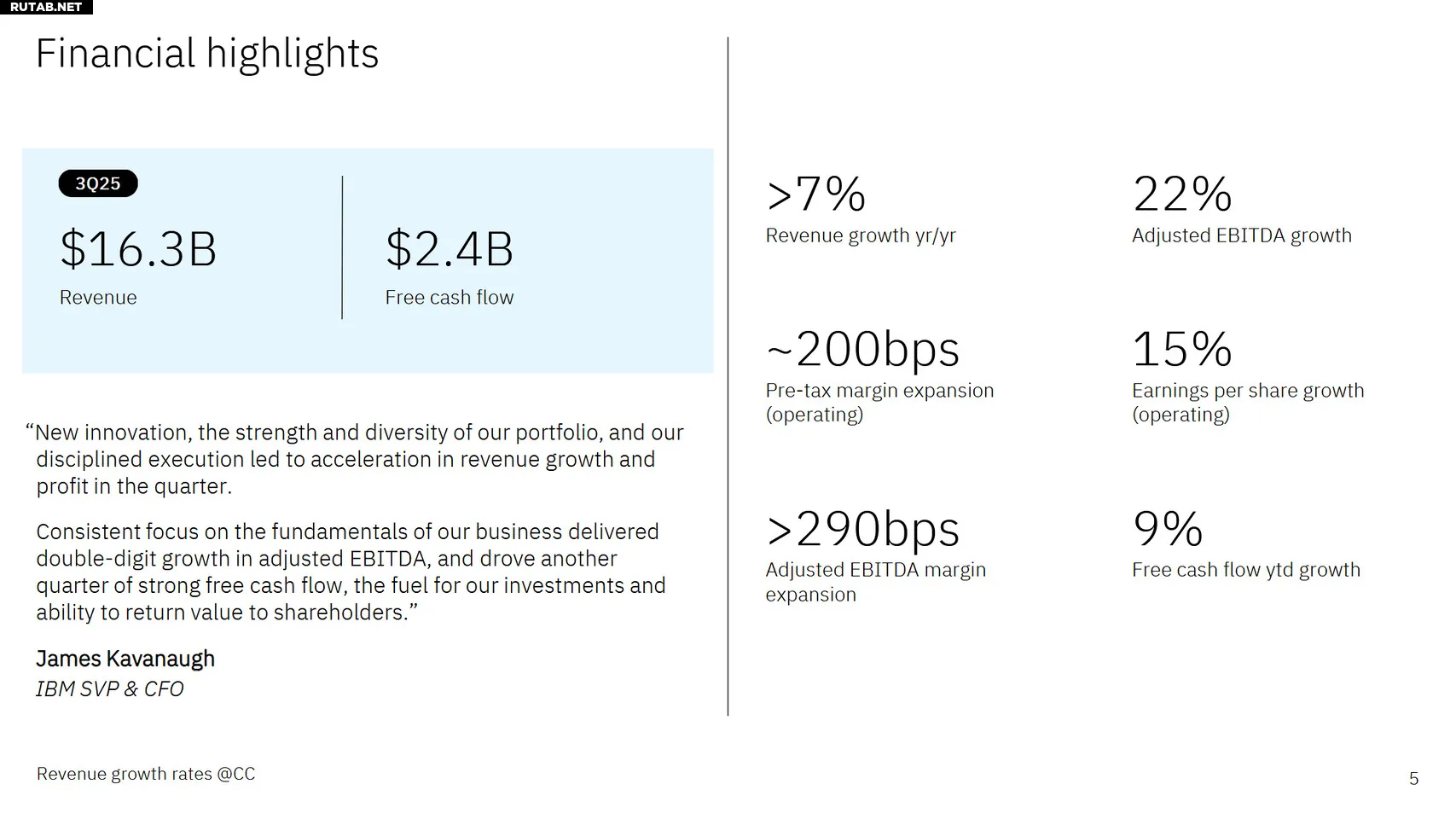 Финансовый директор IBM Джеймс Кавано отметил, что инновации и дисциплинированное исполнение привели к ускорению роста выручки и прибыли. Свободный денежный поток компании за квартал составил 2,4 миллиарда долларов.