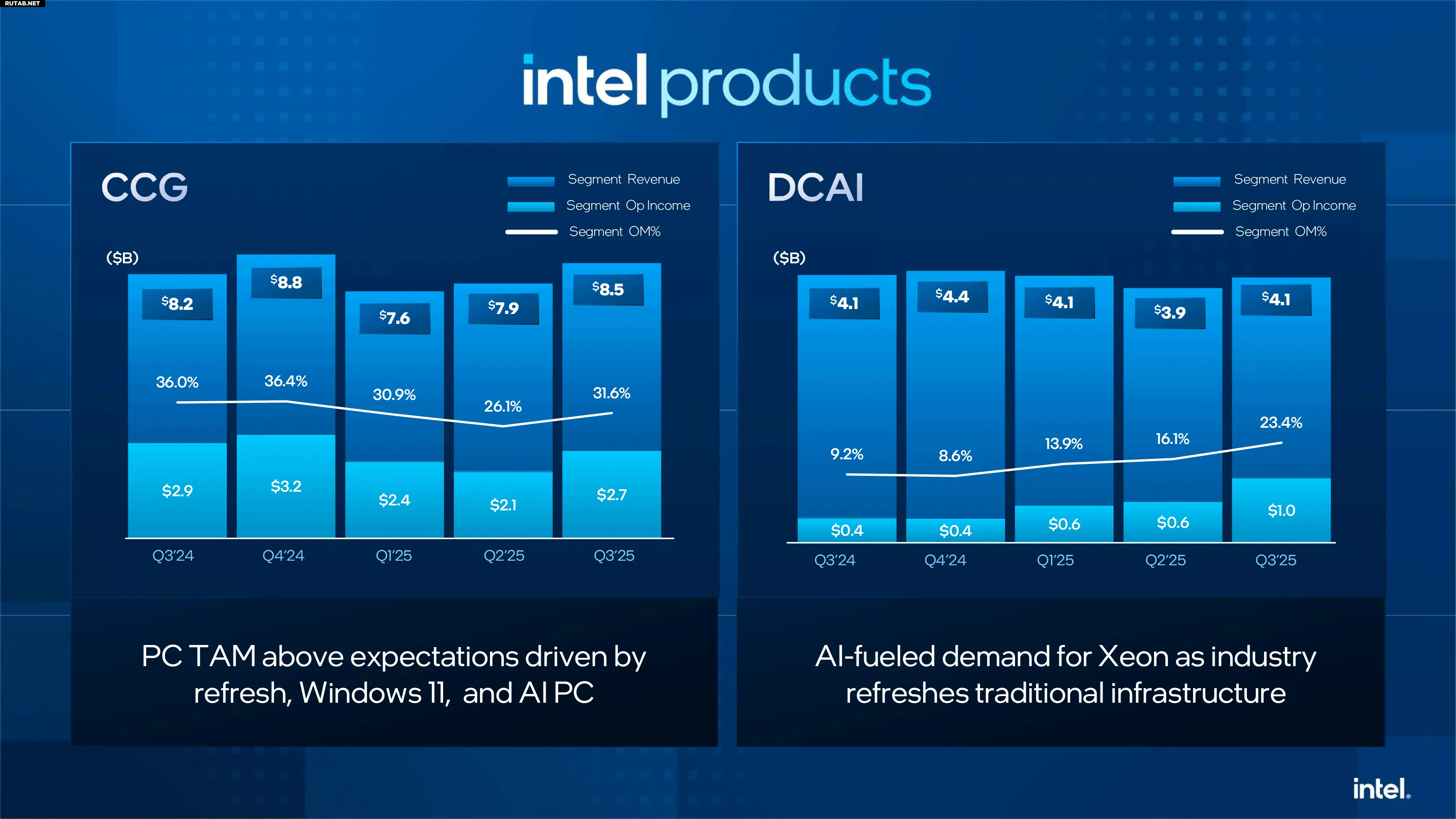 Подразделение клиентских вычислений (CCG) показало сильное восстановление с выручкой 8,5 млрд долларов, что на 7,6% выше предыдущего квартала. Рост был обеспечен более выгодной продуктовой линейкой, включая процессоры Arrow Lake и Lunar Lake.