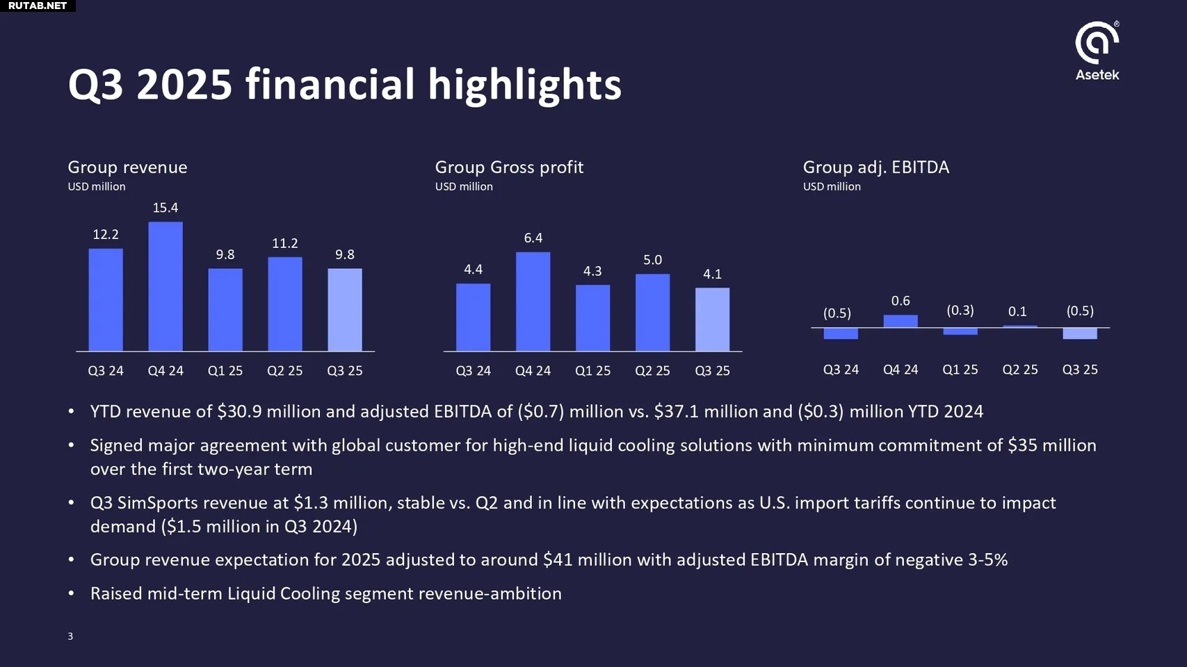 При этом валовая маржа улучшилась до 42% в третьем квартале против 36% в 2024 году. Скорректированный показатель EBITDA составил -$0.5 млн (~40 млн руб), оставаясь на уровне прошлого года.
