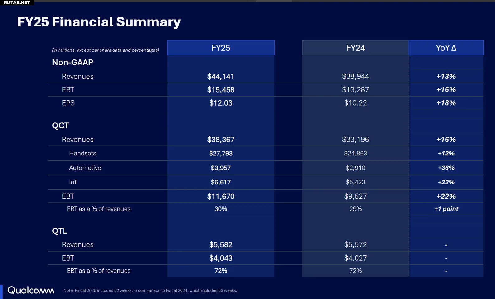 «Наш бизнес остается сильным, о чем свидетельствуют рекордные доходы подразделения QCT в 2025 финансовом году», — заявил президент и генеральный директор Qualcomm Incorporated Криштиану Амон. — «Мы достигли 18% роста общих доходов QCT (без учёта Apple) в годовом исчислении, при этом совокупный доход от направлений «Автомобили» и «Интернет вещей» за финансовый год вырос на 27%. Мы воодушевлены динамикой нашего бизнеса, доступностью нашего стека для автономного вождения и нашим выходом на рынки центров обработки данных и передовой робототехники».