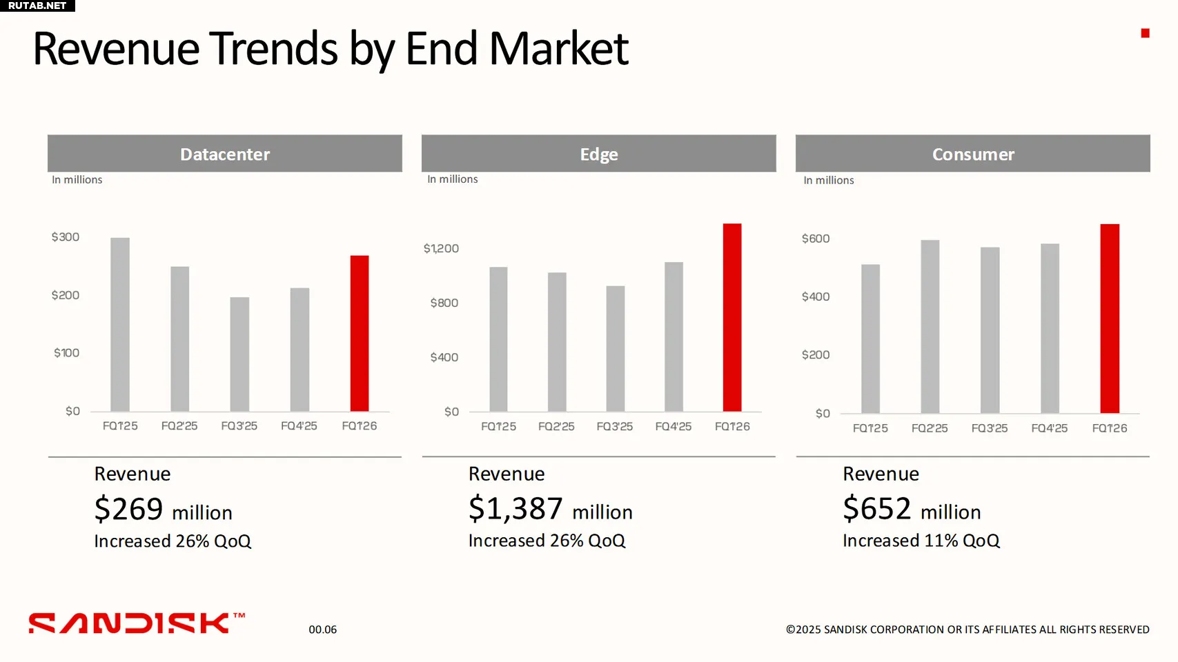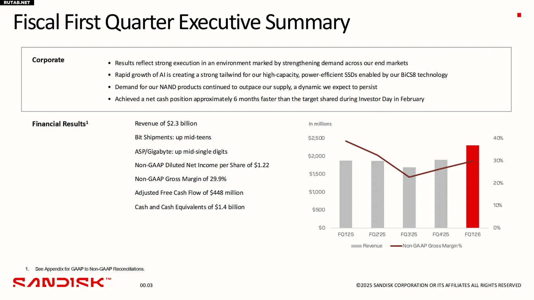 «Клиенты обращаются к Sandisk за нашей передовой технологией и продуктами, которые исключительно хорошо позиционированы в период укрепления спроса», — заявил генеральный директор Sandisk Дэвид Геклер. «Наш сильный баланс и ведущий портфель в сочетании с этой фазой возобновления роста и прибыльности позволили нам достичь вехи положительного чистого денежного потока раньше плана и позиционируют нас для создания значительной долгосрочной стоимости для наших акционеров».