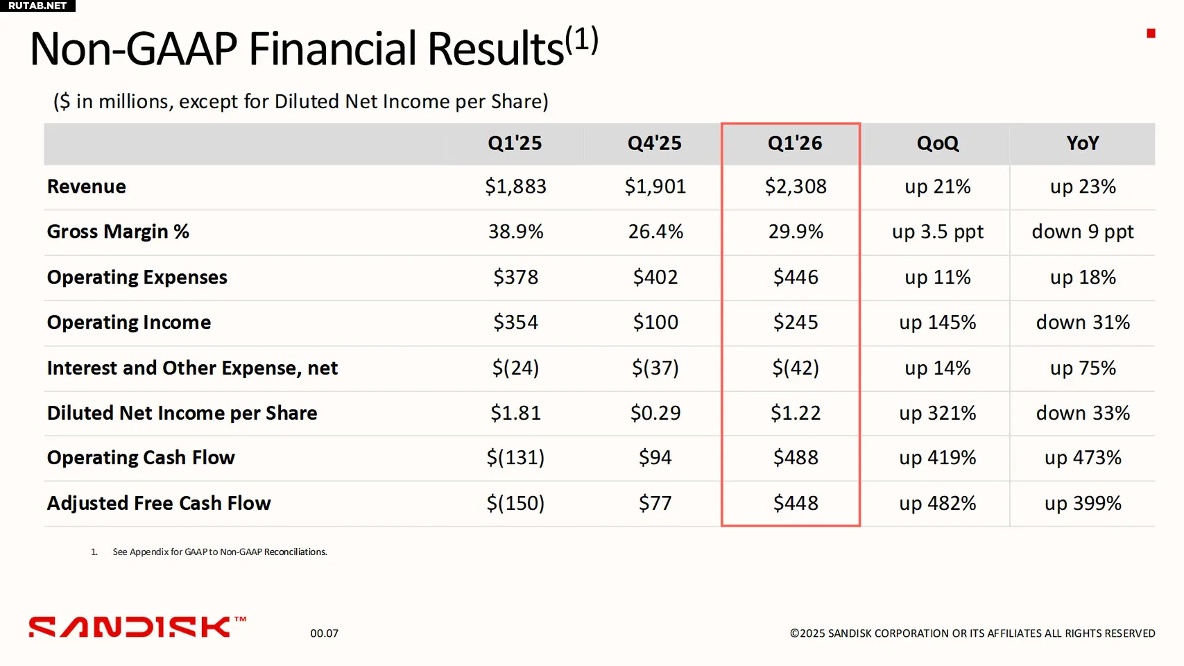 Компания Sandisk Corporation (Nasdaq: SNDK) опубликовала финансовые результаты за первый квартал 2026 финансового года.