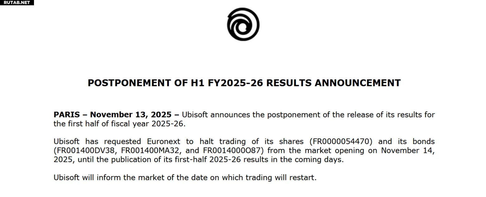 Вот это неожиданный поворот. Буквально за несколько минут до публикации финансовых результатов за первое полугодие 2025-26 финансового года Ubisoft нажала на тормоза и отложила публикацию отчёта на неопределённую дату. Компания также попросила европейскую биржу Euronext приостановить торги акциями и облигациями Ubisoft с 14 ноября до момента публикации результатов.