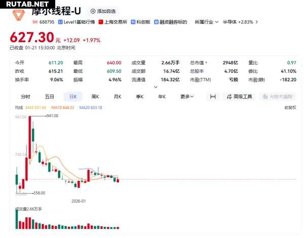 Moore Threads была основана в Пекине в июне 2020 года. Компания вышла на биржу научно-технических инноваций 5 декабря 2025 года по цене размещения 114,28 юаня. Цена открытия составила 650 юаней, а максимальная стоимость акций достигла 941,08 юаня за акцию. По состоянию на закрытие торгов 21 января цена акции составила 627,3 юаня, что примерно на треть ниже пикового значения.