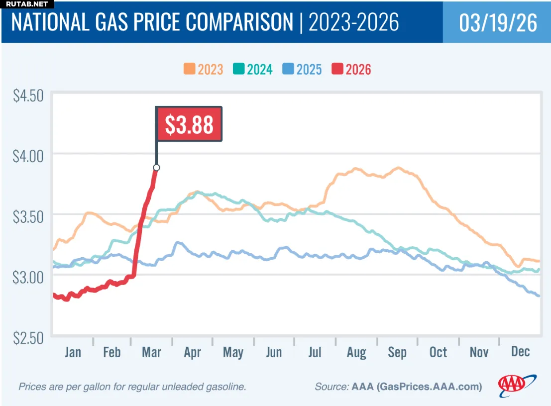 На фоне эскалации конфликта между США, Израилем и Ираном цены на бензин в Соединённых Штатах начали стремительный рост. С начала марта средняя розничная цена на бензин в стране подскочила на 90 центов за галлон (около 24 рублей за литр), что составляет более 30%, и теперь приближается к отметке в 4 доллара за галлон.