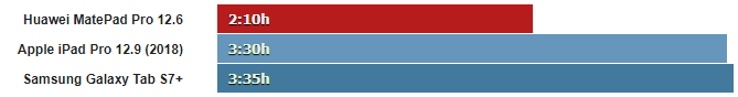 Когда дело доходит до воспроизведения видео, MatePad Pro 12.6 в очередной раз показал отличные характеристики, проработав около 15 часов, прежде чем заряд батареи упал до 10% – снова опередив Tab S7+ на три часа.