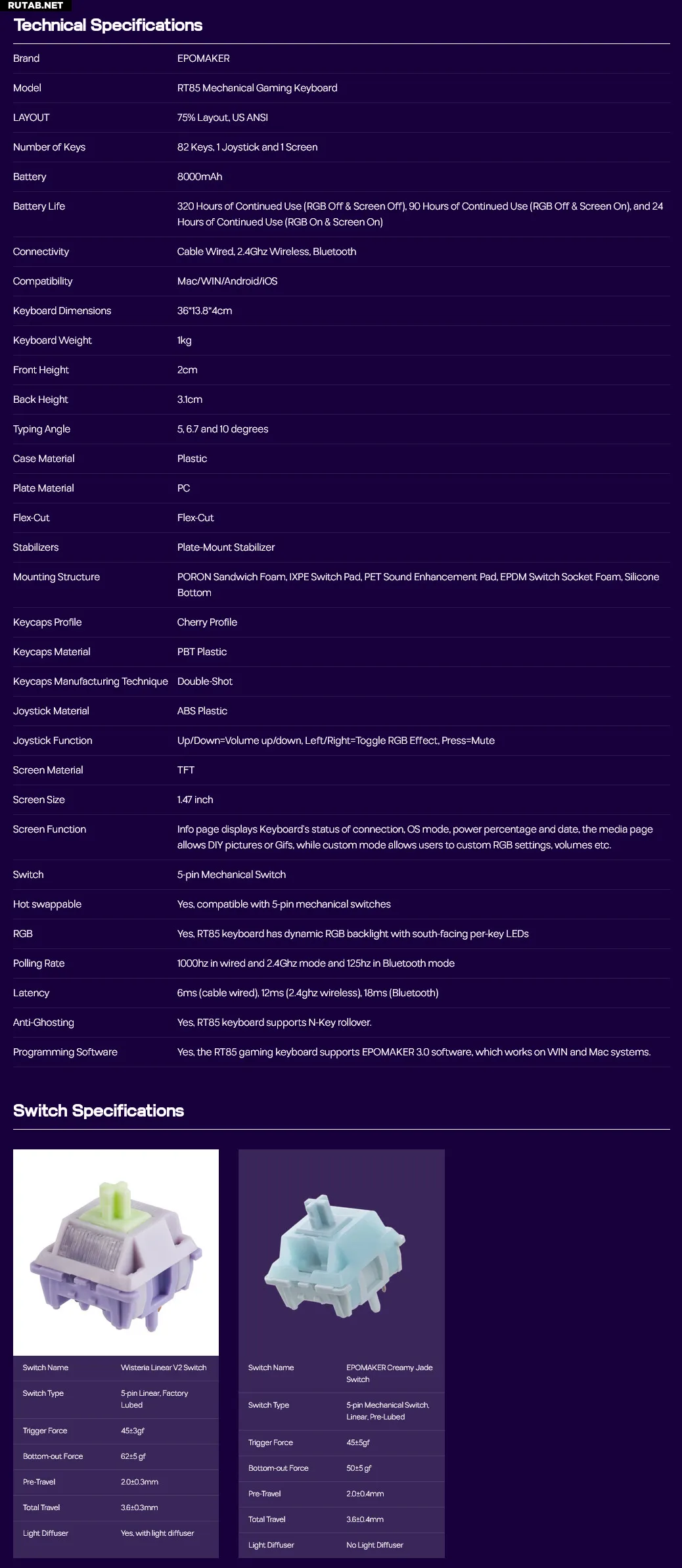 Эргономичные особенности включают PBT-клавиши профиля Cherry и регулируемую подставку с тремя углами наклона. Полная настройка доступна через обновлённое ПО Epomaker Driver, поддерживающее переназначение клавиш, запись макросов, регулировку чувствительности и настройку RGB-подсветки для каждой клавиши. Аккумулятор ёмкостью 8000 мАч обеспечивает длительную работу в беспроводном режиме при отключённой подсветке. Трёхрежимное подключение (USB-C, 2.4 ГГц и Bluetooth) гарантирует совместимость с множеством устройств.