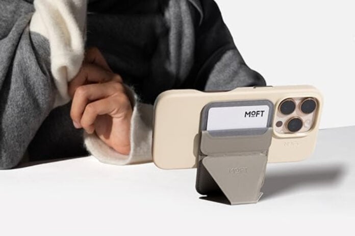 Кошелек-подставка Moft Snap-On Wallet Stand служит одновременно держателем карт и складной подставкой для iPhone. Он совместим с функцией «Где я?» (Find My) и доступен в 25 цветах.