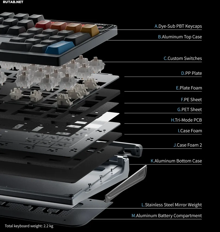 Клавиатура поддерживает три режима подключения: Bluetooth, 2,4 ГГц и проводное через USB Type-C. Она оснащена аккумулятором емкостью 8000 мАч с поддержкой зарядки мощностью 10 Вт. Клавиши выполнены из PBT-пластика с сублимационной печатью в профиле Cherry. В основе конструкции — система крепления «dual-bridge Be-Cu» с резиновыми прокладками, которая обеспечивает звукопоглощение и тактильные ощущения при печати.
