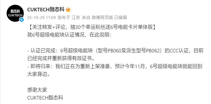 Компания Cuktech (酷态科) объявила, что ее портативный аккумулятор «6号超级电能块» (модели PB060 и PB062) снова получил сертификат соответствия китайскому стандарту 3C (CCC).