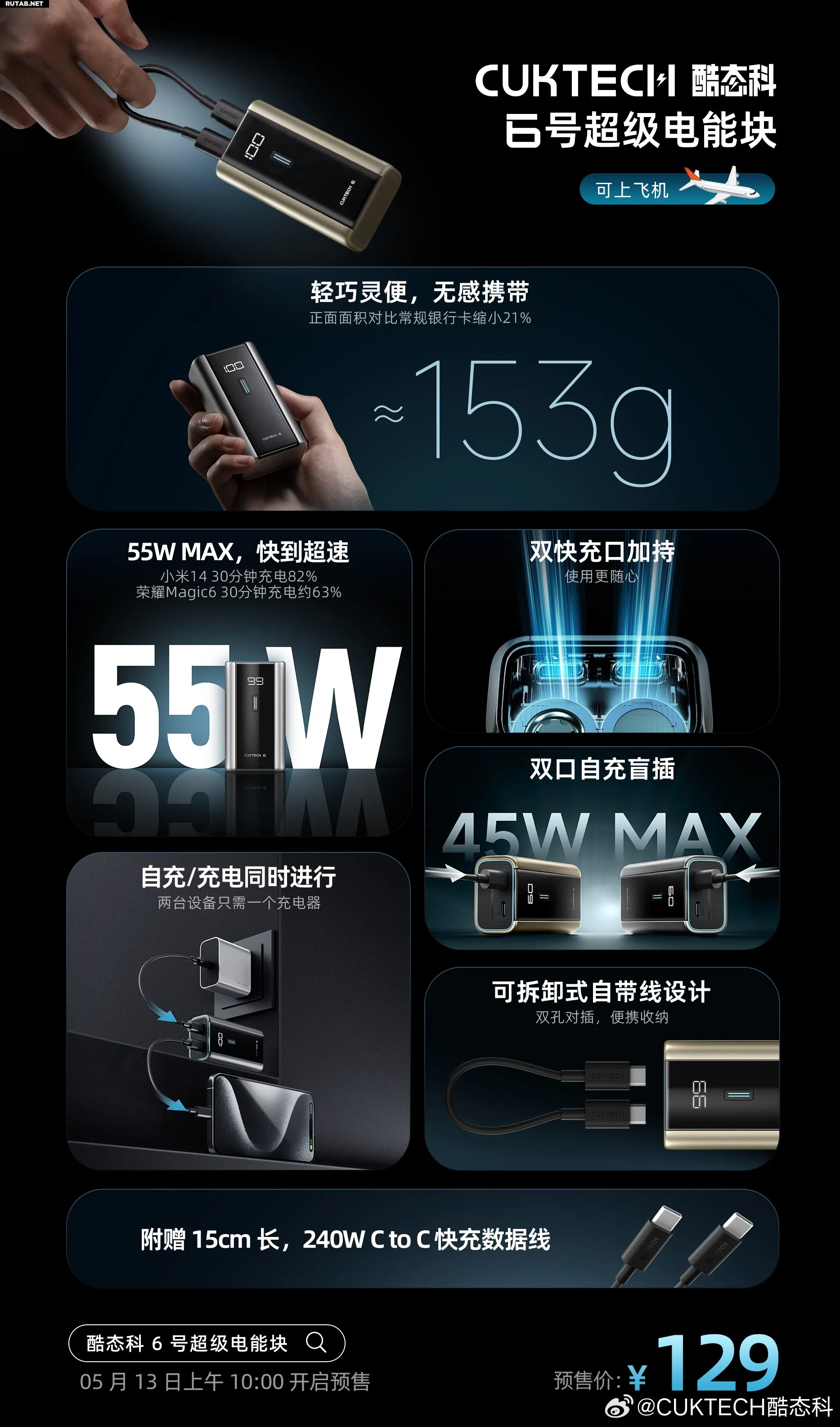 Емкость аккумулятора составляет 6000 мАч, он поддерживает двустороннюю быструю зарядку, оснащен двумя портами USB-C с поддержкой «слепого» подключения. Устройство обеспечивает выходную мощность до 55 Вт и входную — до 45 Вт. В комплект входит съемный кабель USB-C длиной 15 см.