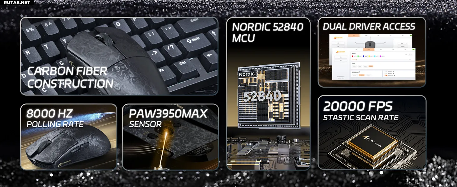 В основе флагмана лежит передовое аппаратное обеспечение. Мышь оснащена фирменным флагманским сенсором PixArt PAW3950MAX с разрешением до 42 000 DPI, скоростью отслеживания 750 IPS и ускорением 50G. Двухдвижковая архитектура на базе чипсета Nordic 52840 гарантирует сверхстабильное беспроводное соединение с практически нулевой задержкой. Благодаря частоте опроса 8000 Гц и статической частоте сканирования 20 000 кадров/с, каждое движение и клик фиксируются с миллисекундной точностью, устанавливая новый стандарт скорости и точности. Фирменный режим «Hunting Shark Mode» дополнительно повышает чувствительность отслеживания, позволяя игрокам выполнять даже самые тонкие манёвры, что считается ключевым преимуществом в киберспортивных дисциплинах.