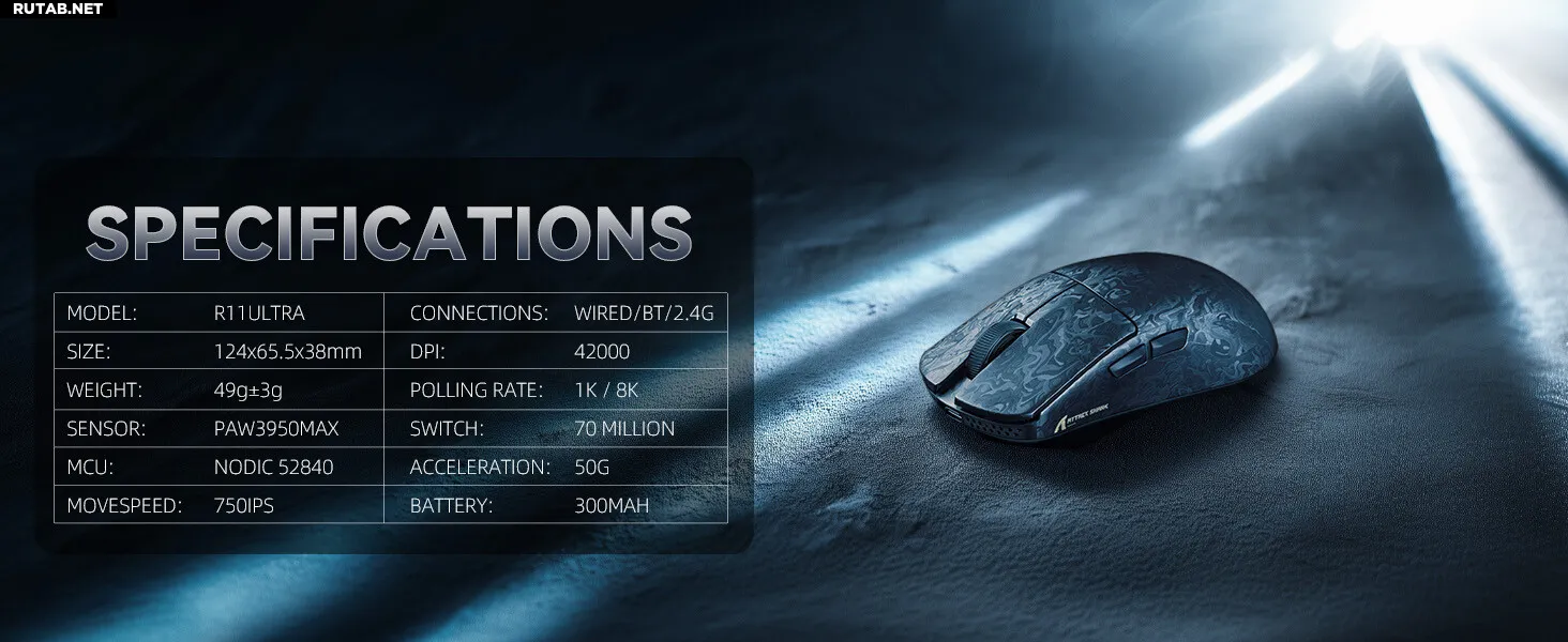 Эргономика и долговечность R11 ULTRA также выведены на новый уровень. Покрытие Nano-Metal Ice остаётся прохладным даже во время многочасовых игровых сессий, а двойные тефлоновые ножки обеспечивают плавное скольжение. Оптические переключатели Omron с ресурсом в 70 миллионов кликов и энкодер F-Switch, рассчитанный на 2 миллиона циклов, гарантируют долговечность. Сочетание продуманной эргономики и промышленной прочности создаёт опыт, ориентированный как на профессионалов, так и на энтузиастов.