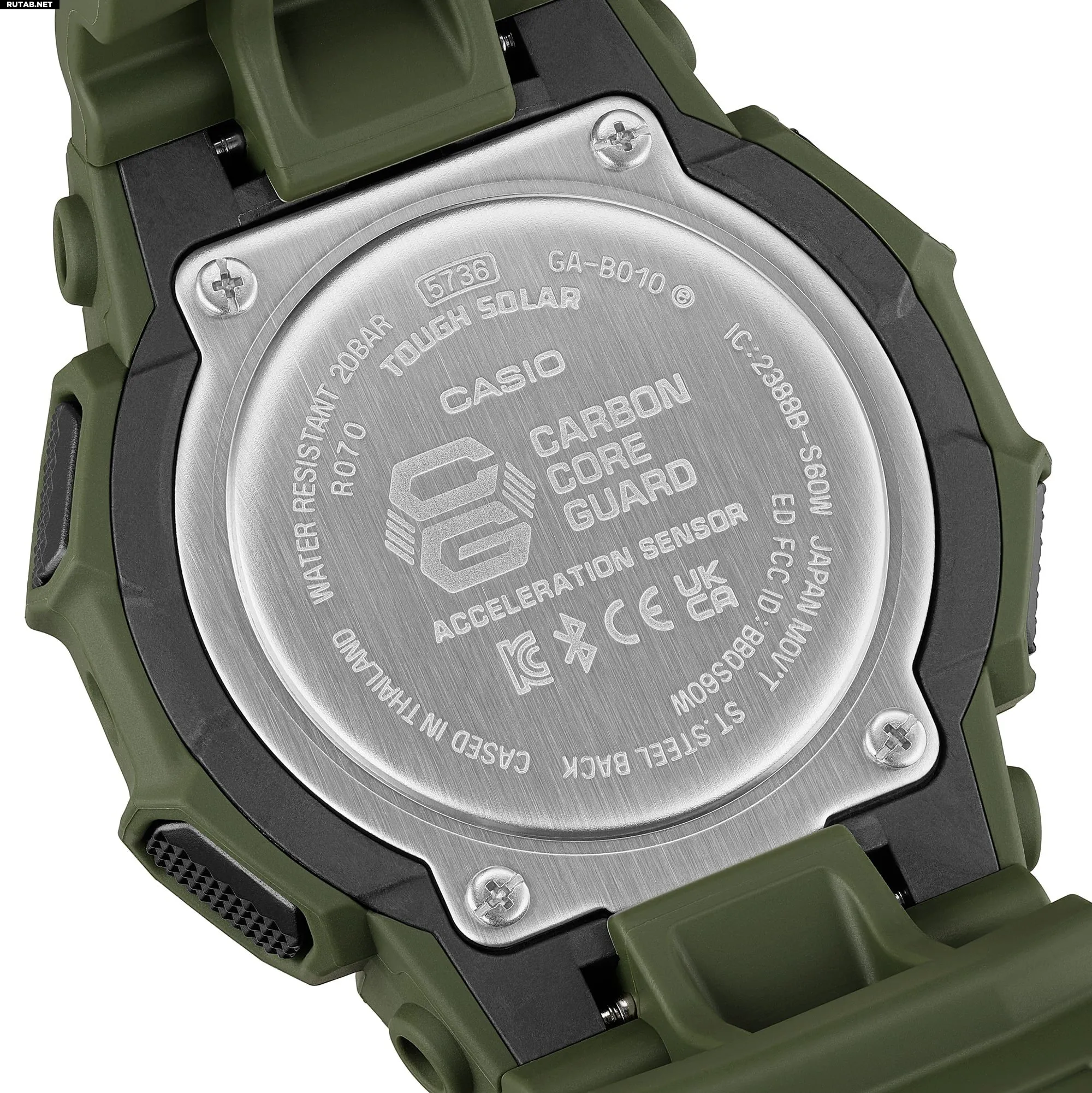 GA-B010 — это модель с крупным корпусом, работающая на солнечной энергии Tough Solar и поддерживающая Bluetooth-соединение. Часы оснащены новым модулем LSI и алгоритмом, которые снижают энергопотребление при подсчете шагов примерно на 40% по сравнению с моделью GBA-800. Устройство отслеживает шаги, показывает ежедневные итоги на ЖК-экране и отображает прогресс по достижению цели. Напоминание о шагах предупреждает пользователя, если он не двигался в течение некоторого времени. Данные о шагах также можно передавать на смартфон через приложение Casio Watches.
