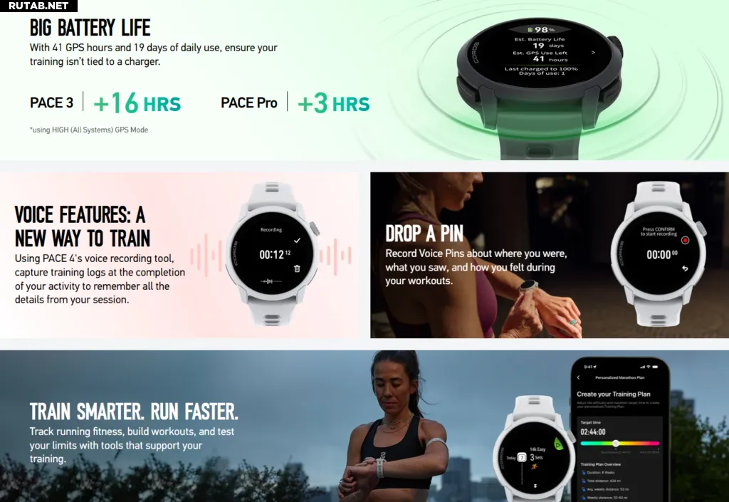 Новая модель предлагает до 41 часа автономной работы в режиме GPS и до 19 дней при обычном ежедневном использовании, что на 16 часов больше, чем у PACE 3. Она поддерживает GPS, ГЛОНАСС, Galileo, Beidou и QZSS с более быстрым и точным захватом спутников. В PACE 4 используется переработанный оптический датчик сердечного ритма для повышения точности, минимизирующий скачки и провалы показаний во время тренировок.