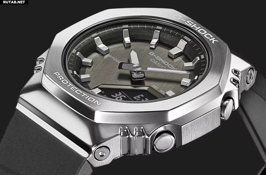 Модели различаются цветовым исполнением: GM-S2110-1A1 имеет черный циферблат с негативным дисплеем (темный фон), а GM-S2110-1A7 — серебристый циферблат с позитивным дисплеем, который легче читается. Обе модели комплектуются черными резиновыми ремешками для легкости и комфорта. При размерах 45,9 × 40,5 × 11,0 мм и весе всего 56 грамм эти часы относятся к самым удобным для ношения G-Shock с металлическими элементами.