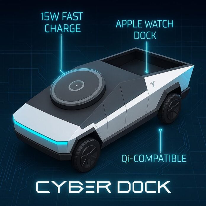 Если вы любите Tesla, вам наверняка захочется «припарковать» свой iPhone на этой зарядке. Зарядная станция CyberDock 3-in-1 выполнена в виде миниатюрного Cybertruck и позволяет одновременно заряжать ваш MagSafe iPhone, AirPods и Apple Watch. Особую привлекательность ей придают угловатые линии в духе брутализма и встроенная подсветка, которая загорается во время зарядки. Помимо MagSafe-панели на 15 Вт для iPhone, здесь также есть док для Apple Watch, который выдвигается из «багажника» зарядки, и место для зарядки Apple AirPods.