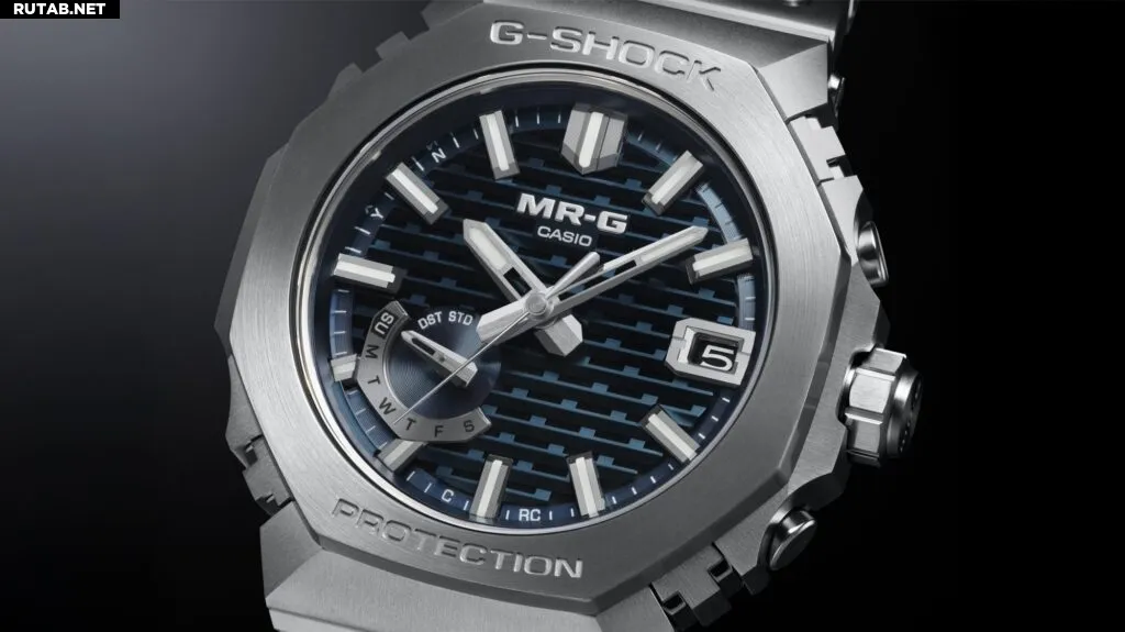 Часы MRGB2100D-2A имеют серебристый корпус и синий циферблат, вдохновлённый традиционным японским оттенком «ханада-иро». Циферблат украшен горизонтальной текстурой, массивными металлическими часовыми метками, обрамлённым окошком даты на позиции «3 часа» и небольшим дополнительным циферблатом дня недели на «7 часах», что создаёт сбалансированный и очень читаемый дизайн.