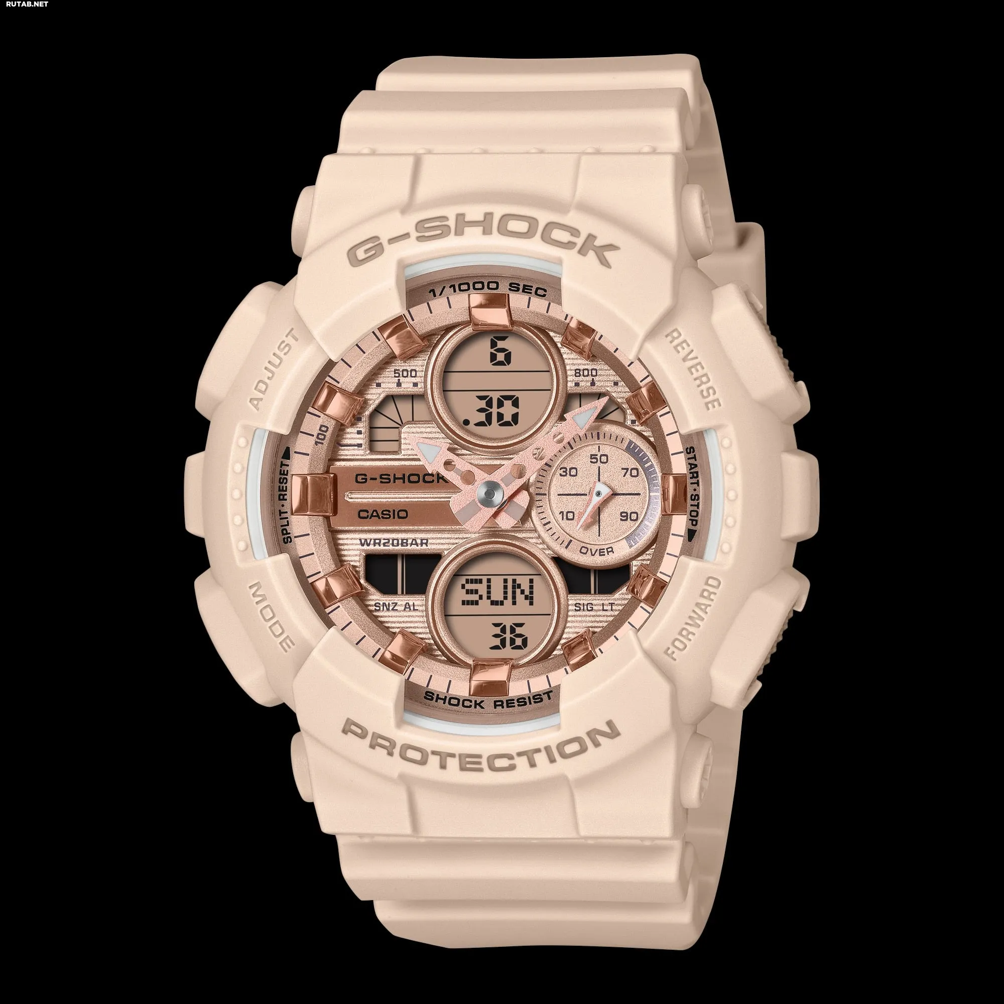 Компания Casio представила в Японии три новые модели часов G-Shock серии GMA-S140, отличающиеся металлическими розово-золотыми деталями. Коллекция включает модели GMA-S140PG-1A с черным корпусом из смолы, GMA-S140PG-4A в светло-розовом цвете и GMA-S140PG-7A в белом. Каждая модель оснащена циферблатом с металлическим розово-золотым покрытием и фоновой подсветкой цифровых вставок в цвете розового золота.