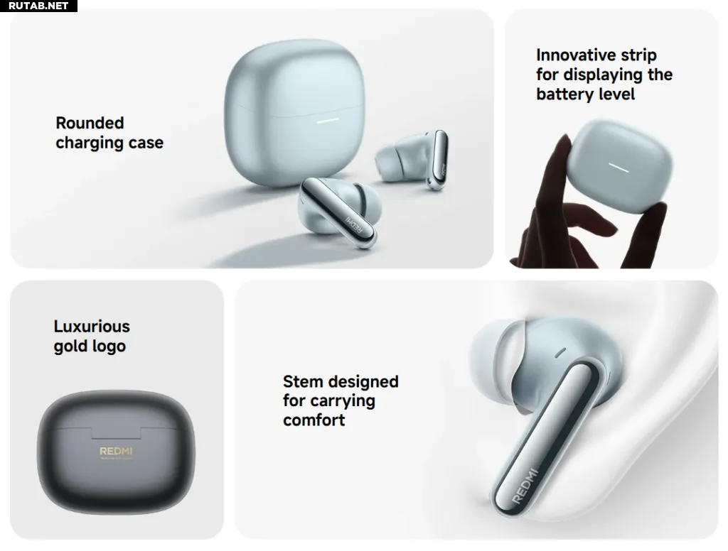 Дизайн включает силиконовые амбушюры и выступающую ножку. Наушники имеют степень защиты IP54 от пыли и влаги. Автономность составляет 8 часов от одного заряда и до 33 часов с использованием зарядного кейса. Это немного меньше, чем у Buds 6 Pro (9,5 и 36 часов соответственно). Пятиминутная зарядка обеспечивает около 2 часов воспроизведения. Кейс с USB-C портом оснащён светодиодной полоской-индикатором заряда.