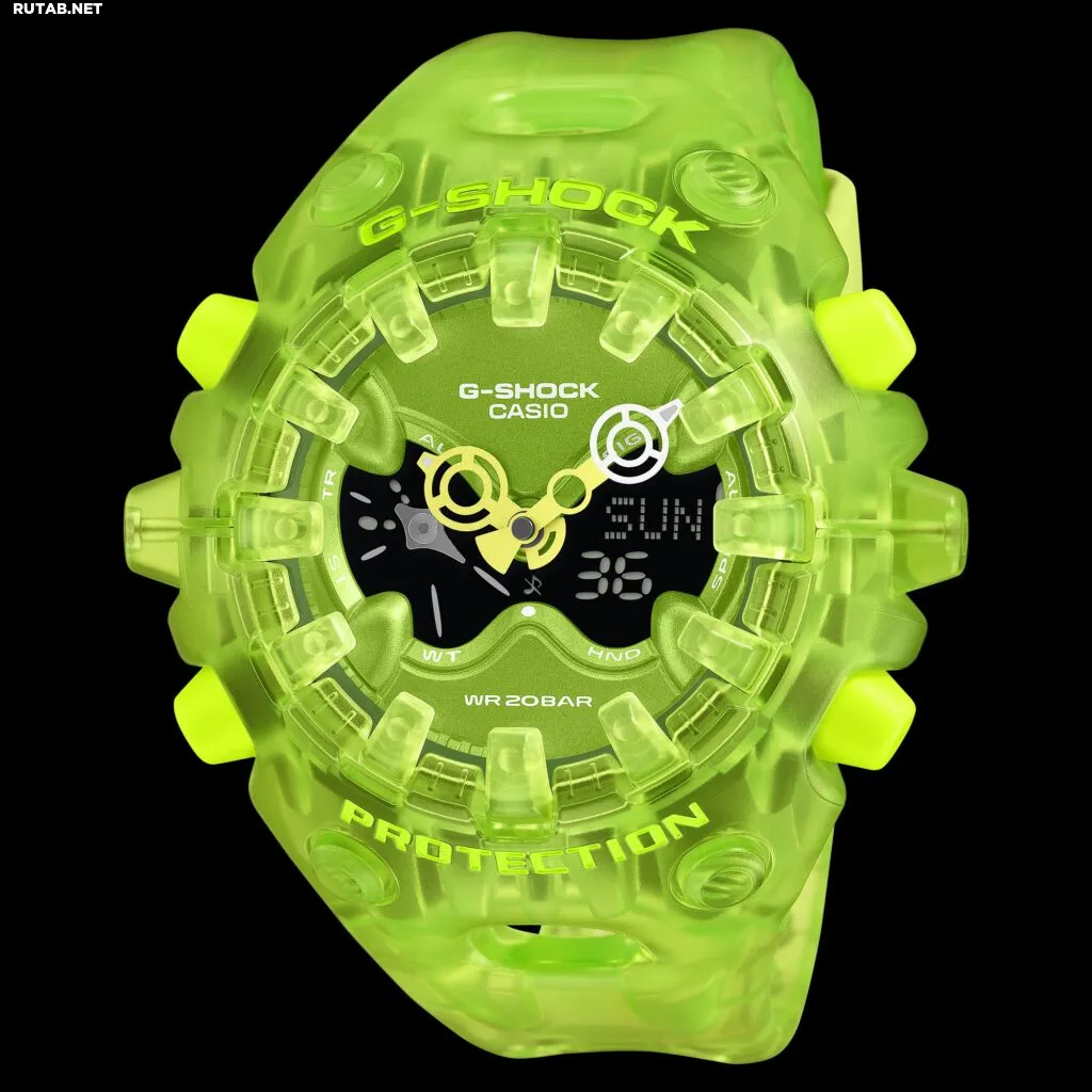 Новые модели сохраняют футуристичный индустриальный дизайн серии GA-V01, но заменяют сплошные корпуса на прозрачные. Casio представила четыре цветовых варианта: оранжевый (GA-V01SKE-4A), зелёный (GA-V01SKE-3A), фиолетовый (GA-V01SKE-6A) и серый (GA-V01SKE-8A). Полупрозрачный дизайн вдохновлён популярной эстетикой Y2K, напоминая внешний вид технологичных продуктов и аксессуаров начала 2000-х годов.