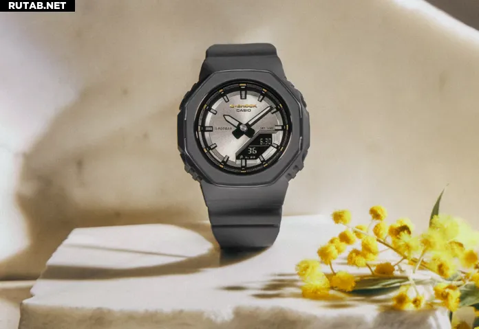 Что это: Компактный аналогово-цифровой G-Shock, выпущенный к Международному женскому дню 2026 года. Он отличается серым корпусом, металлическим циферблатом и сдержанными золотистыми акцентами. Часы построены на тонкой платформе GMA-P2110, используют корпус и ремешок из биосмолы, что подчеркивает экологичность.