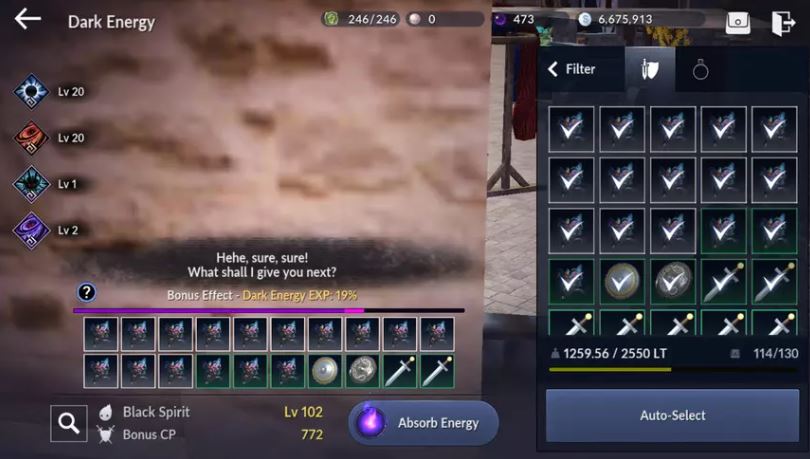 Больше всего опыта можно выручить с основных типов оружия и доспехов. Но вам нужно ориентироваться на рынок. Со временем синий ранг экипировки обесценится, и им станет выгоднее кормить Черного Духа.