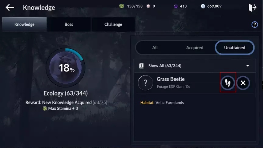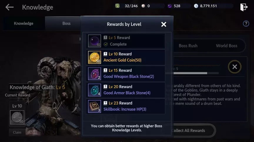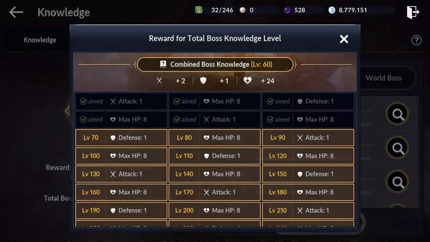 В отдельной вкладке вы можете увидеть знания боссов. У каждого босса присутствует свой уровень знаний. С повышением вашего уровня, увеличиваются уровни каждого босса. Впрочем, за достижения определённого порога знаний, вы получите баффы в виде защиты, атаки и опыта. К тому же, за повышения уровней боссов вам дадут много полезного, например, увеличение лимита прохождений.