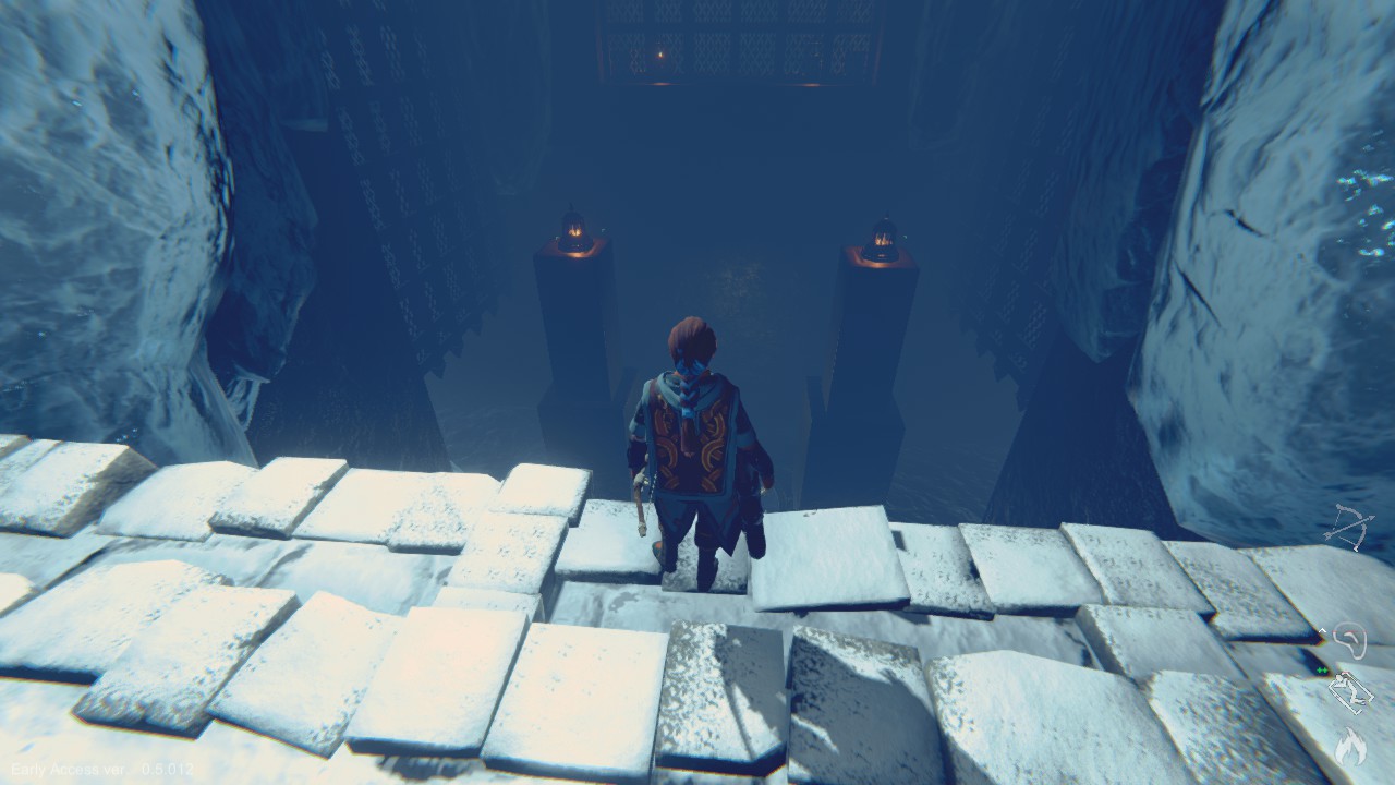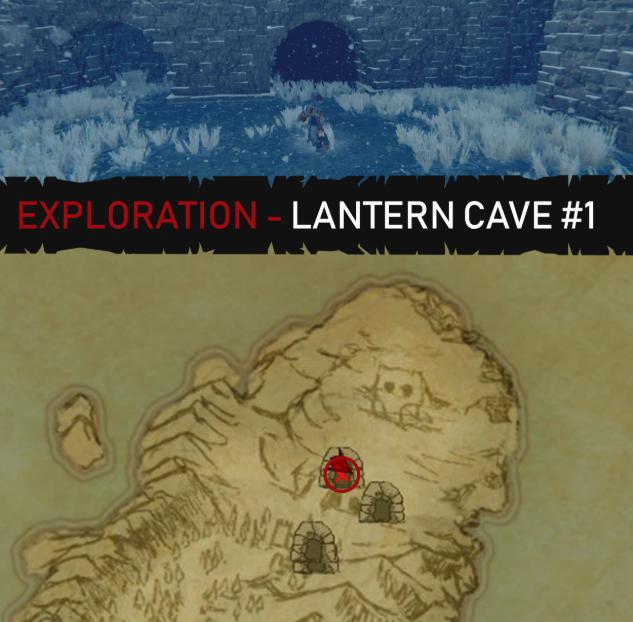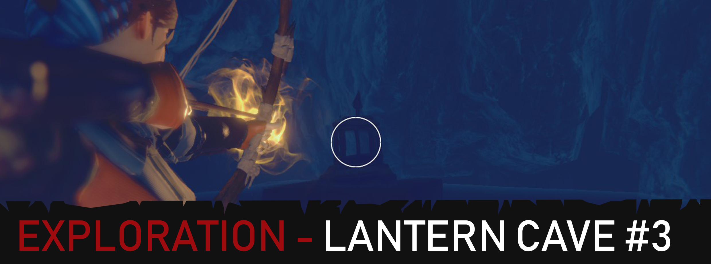 Начальный алгоритм идентичен Пещере Ветра: rогда вы войдете в эту пещеру, вы увидите обустроенный лагерь. Используйте его, отдохните, приготовьте еду, снаряжение. Используйте зажженный фонарь слева, чтобы зажечь фонарь справа от него. Теперь вы можете использовать эти два фонаря, чтобы зажечь остальные. Как только вы зажгёте их, ворота перед вами поднимутся, позволяя вам переплыть на другую сторону, но пока не нужно этого делать.