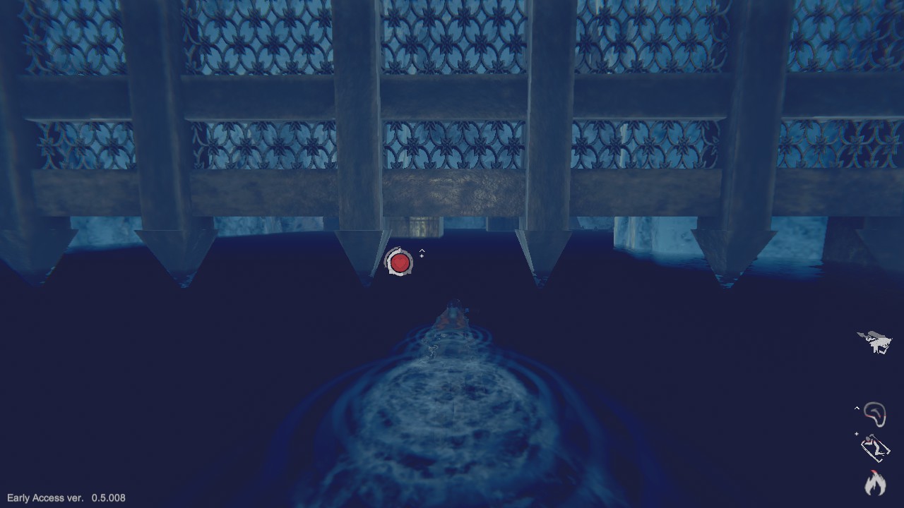 Подплывите к каменной области, где находится второй набор фонарей, и вы найдете большую прижимную пластину. Встаньте на неё, чтобы временно слить воду из зоны, что позволит вам получить доступ к еще двум фонарям на дне ранее заполненной водой ямы. Подожгите все фонари что вы увидите. Как итог, поднимутся ещё одни ворота.