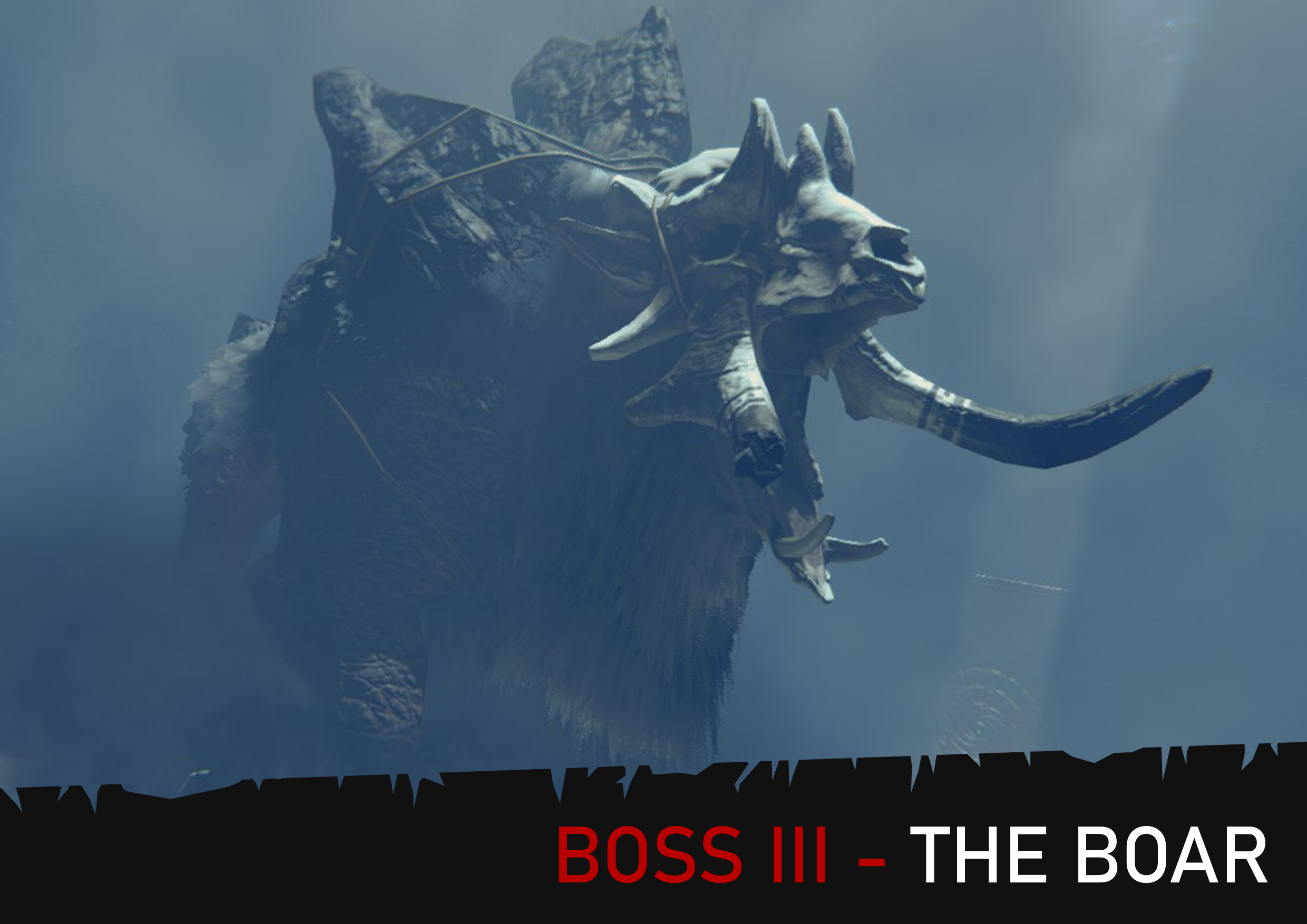 «Кабан» будет ждать вас в глубокой пещере, для доступа к которой вам понадобится крюк. Как подойдёте к большой и массивной каменной двери, встаньте на нажимную плиту, войдите внутрь. Вы достигнете области с другой прижимной пластиной, которая активирует два противовеса, которые также открывают ворота на другой стороне. Вам нужно будет схватиться за верх одного из этих противовесов, пока он находится высоко, а ворота все еще открыты, а затем используйте Парусную Ткань, чтобы пройти под ворота, как только вы это сделаете, запустится кат-сцена и битва начнётся.