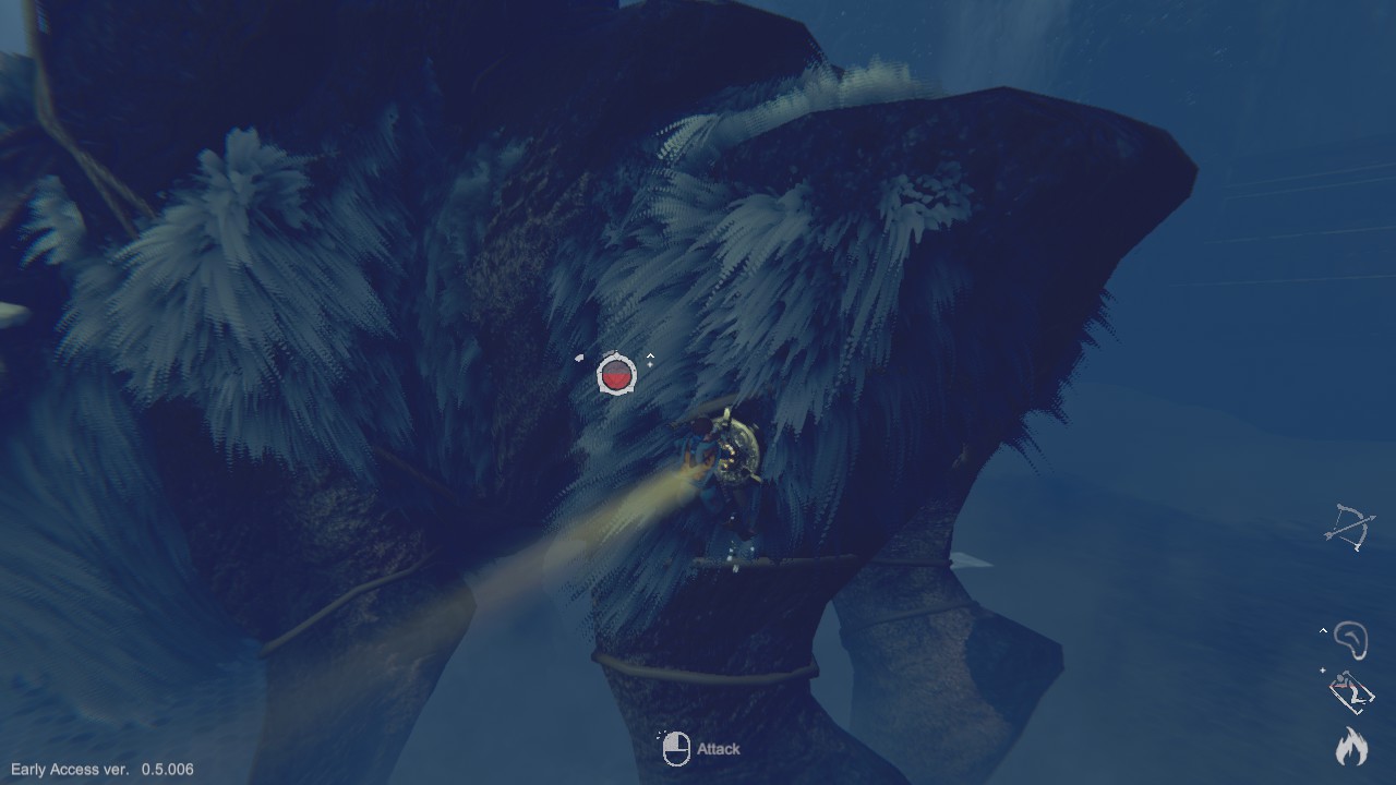 После разговора с сигилом, запустится кат-сцена с появлением колосса Сатира. Вы окажатесь сразу перед ним. Есть пару способов, как залесть на него, но лучше если вы в начале пробежитесь по арене, чтобы оценить обстановку. На земле есть два жаровни, на которых есть готовое мясо. Соберите их, еда пополнит счетчики голода и здоровья, также не забудьте про два куста с ягодами, заберите еду. Но не забывайте поглядывать за боссом, так как он применяет атаку с расстояния «морозное дыхание», эта атака нацелена на истощение вашего счётчика тепла.