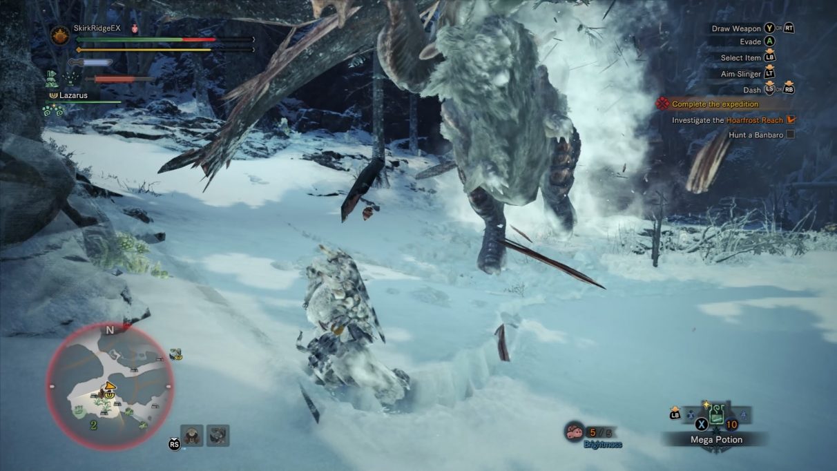 В любом случае, Банбаро нужно время на "перезарядку" способностей. В эти моменты атакуйте. Вы можете использовать Коготь, чтобы сократить расстояние или прицелиться в определенную часть тела, если это необходимо. Будьте бдительны в момент приближения, Банбаро иногда кидается валунами с близкого расстояния.